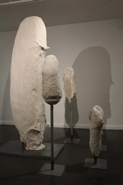 Towards the back of the gallery [TJ Boulting] are a group of plaster forms titled ‘voids’. Produced by repeatedly carrying out rotational movements, commonly used in dance to carve and engage the space immediately surrounding the body, these motions isolate and in an abstract sense ‘pinch-off’ sections of space between the body and its curved limbs. This group, positioned to reflect the absent figure at its centre, was conceived with the pierced forms of Henry Moore’s figures in mind. These shapes are sculpted directly in plaster and displayed at the orientation and height at which they were produced. Like so many things composed underground these sculptures were made slowly and through a mindful repetition that the plaster sediments in very specific yet amorphous forms. The final encounter in the gallery however will not actually be so, as the viewer must now invert and repeat his or her own motion to exit the space, therefore intrinsically reflecting the mirrored action the artist has explored in the work. - TJ Boulting
